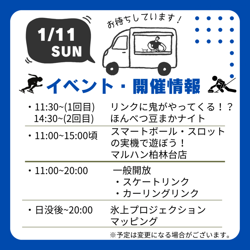 日程時間イベント名イベント協力者イベント内容12月27日(土)13:00〜14:00フィギュアスケート演技帯広フィギュアスケーティングクラブシングル、グループ演技。今年はKPO...