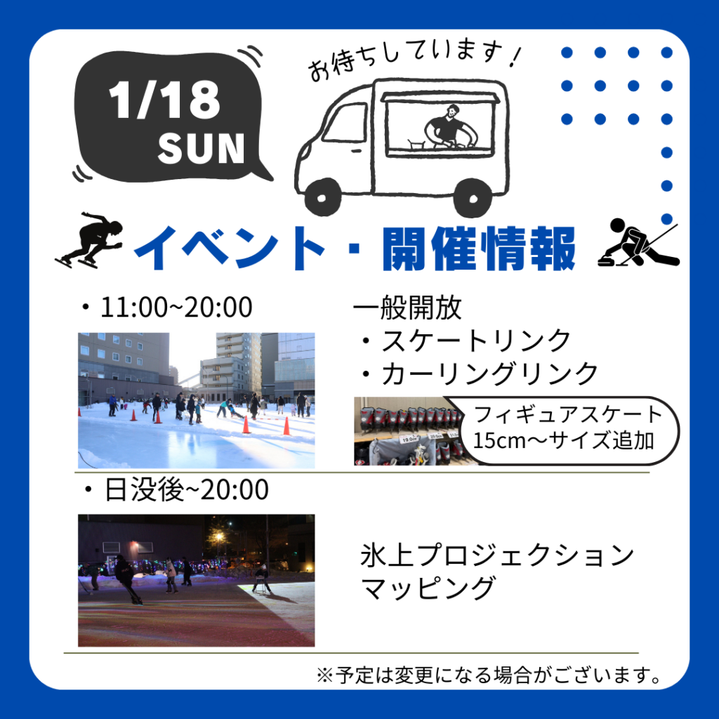 イベント開催情報 日程時間イベント名イベント協力者イベント内容12月27日(土)13:00〜14:00(11:30〜14:00はスケート一般滑走はできません。)フィギュアスケート演技帯広フィギュアスケー...