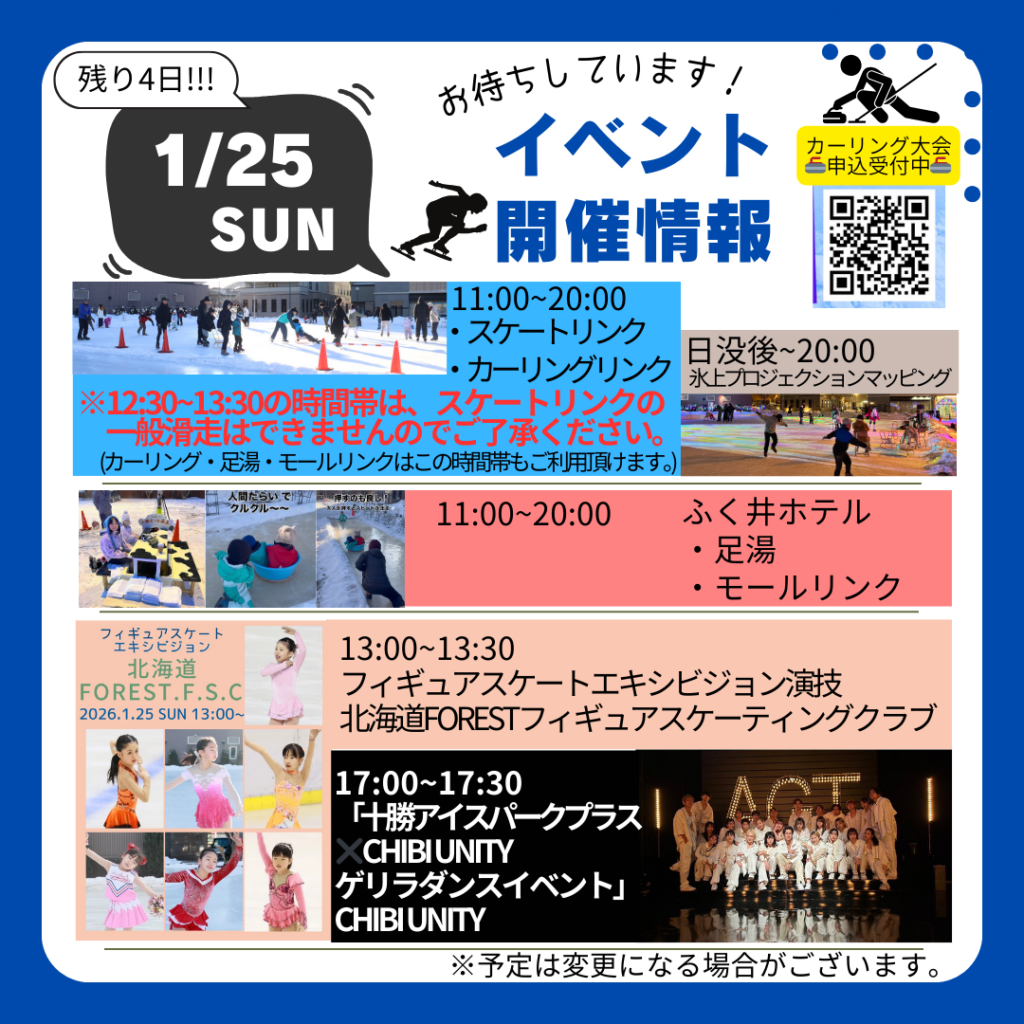 本日1月25日(日)は「足湯」「フィギュアスケート演技」「ゲリラダンス」のイベントも実施しますよー!
