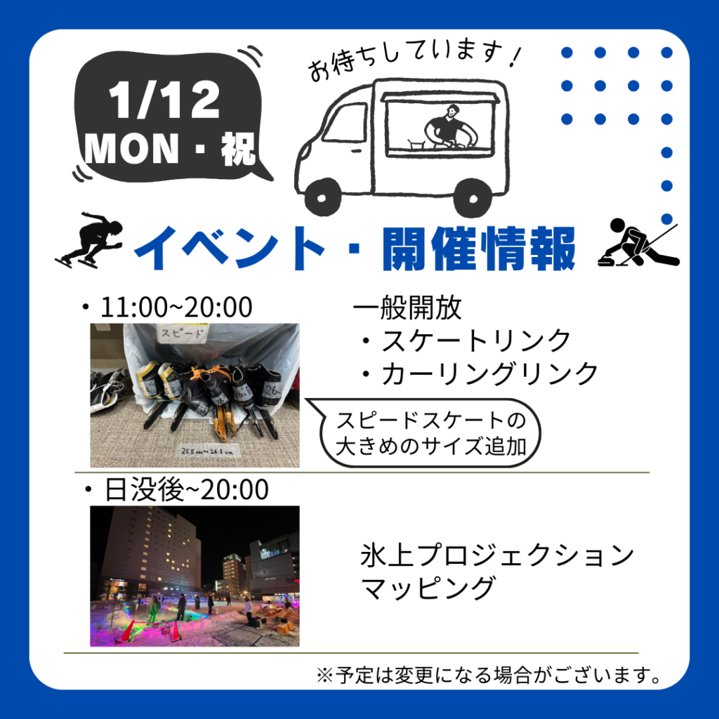 日程時間イベント名イベント協力者イベント内容12月27日(土)13:00〜14:00フィギュアスケート演技帯広フィギュアスケーティングクラブシングル、グループ演技。今年はKPO...
